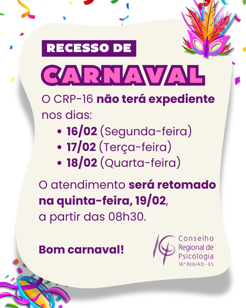 O CRP-16 informa que não terá expediente durante o Carnaval.